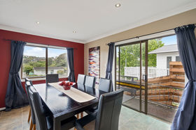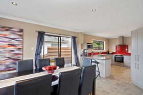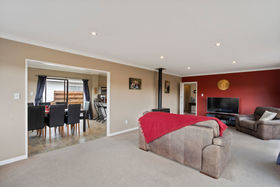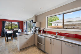 A large kitchen enjoys plenty of space and natural light and the open plan design incorporates the dining room with ease. Open the sliding door to let a summer breeze through the dining room, then move through to the large lounge. The lounge opens directly to a paved patio, perfect for BBQ, and out to the terraced back lawn and garden. Over the cooler months the lounge and home are kept warm with the wood burner fireplace. This much-loved home features three bedrooms, a well-appointed bathroom and a separate toilet and laundry for family functionality.